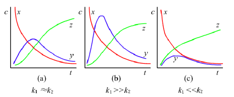 - \({B \longrightarrow \,\,C\quad r_2 = k_2[B]}\)