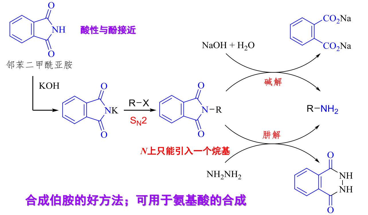 该反应目的是合成伯胺,途径为以邻苯二甲酰亚胺的钾盐为亲核试剂,与卤代烷进行烷基化反应,所得到的N-烷基邻苯二甲酰亚胺经水解或肼解得到伯胺。