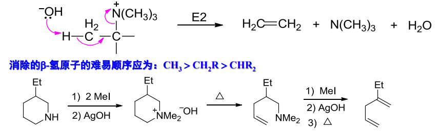 对于Hofmann消除,其指的是含有\(\ce{\beta-H}\)的季铵碱,在受热时则分解为烯烃、叔胺和水。且其遵循Hofmann规则。