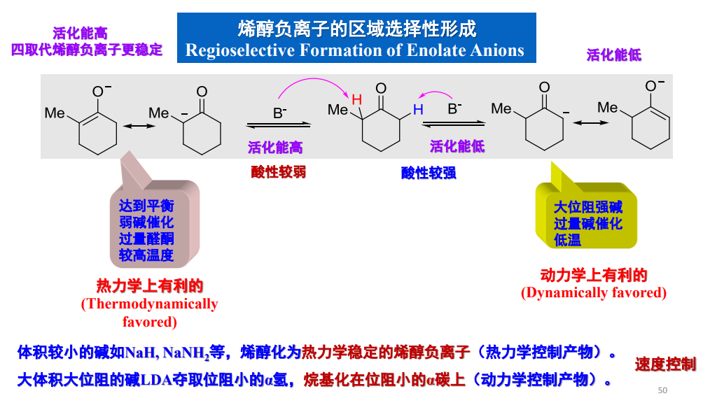 在大位阻强碱催化且低温的情况下,动力学控制,烷基化位点一般在α-氢酸性较大的一侧。在弱碱催化,较高温度且反应物过量时,热力学控制,倾向于选择有更加稳定的烯醇负离子中间体的反应途径。